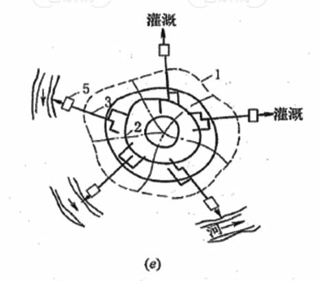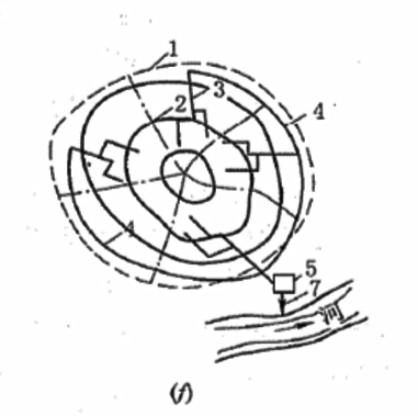 环绕式:由分散式慢慢发展为环绕式,环绕式可以将分散式中的多个污水处理厂合并为一个大型污水处理厂(污水处理厂规模越大效率越高,水质、水量变化程度小,有利于运行管理)。