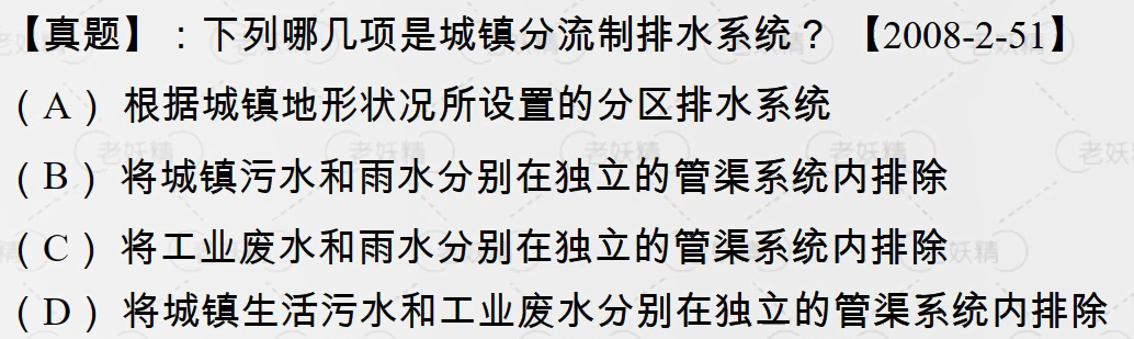 正确选项:B、C、D;D选项指出污水和废水分别在“独立”的管渠系统内排出,说明不跟雨水使用同一管道,故也是分流制。