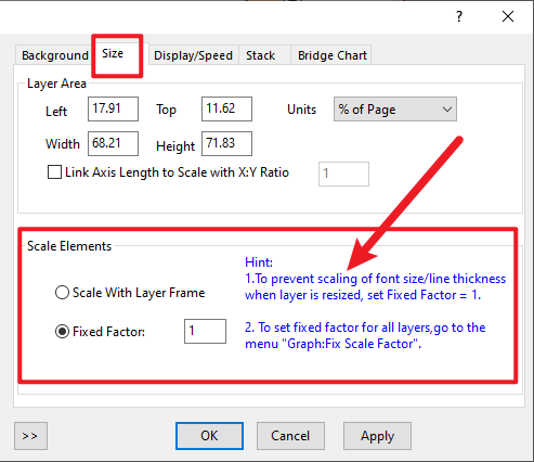 在Graph设置中,设置Fixed Factor=1,这样不管我们如何在Origin中缩放图片,导出到Word的时候,字号都是不变的。