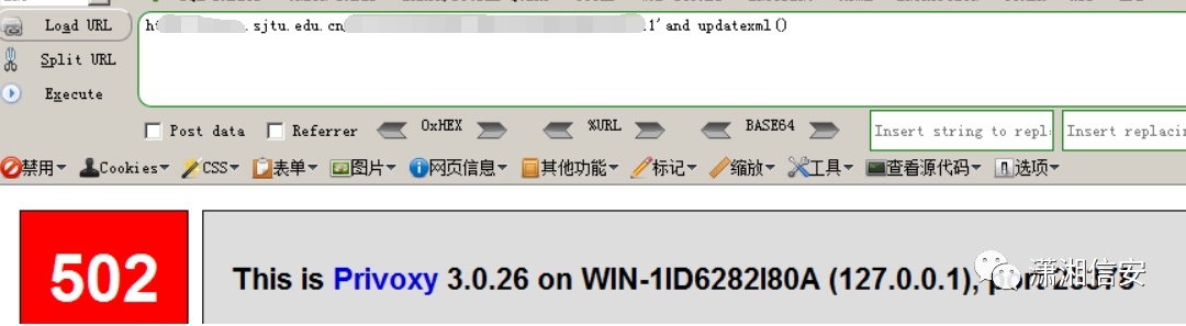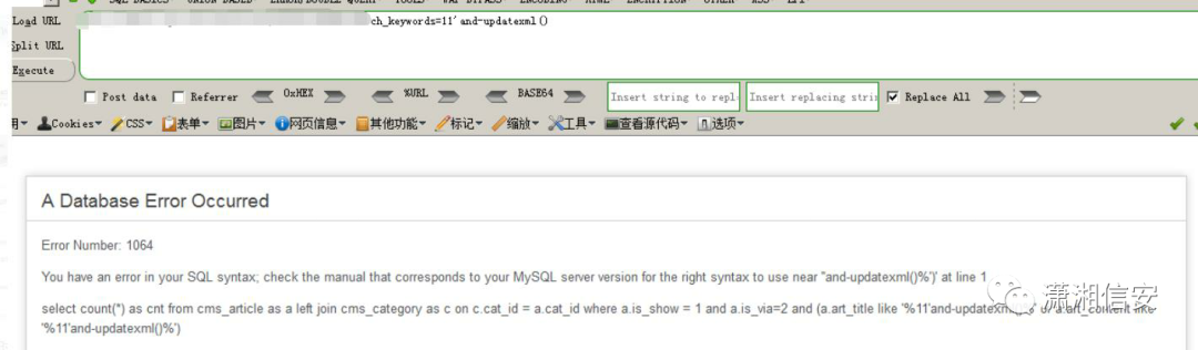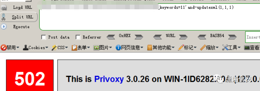 这里我们打算使用 updatexml 来进行报错输出,在 url 后面添加 and 发现并没有拦截,但是如果在 and 后面空格然后跟 updatexml 直接被拦截