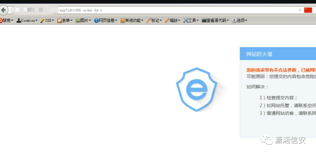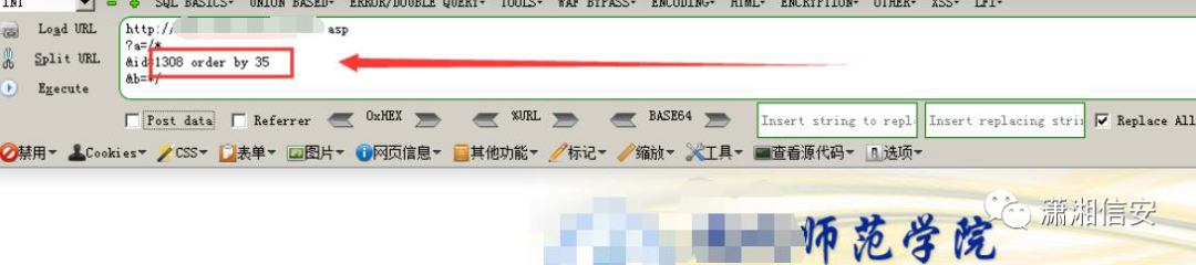 `http://xxxx/xxxx.asp?a=/&id=1308%20order%20by%2035&b=/ order by 35 正常`Other