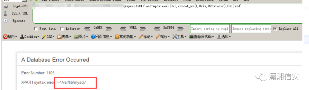 现在我们来构造报错内容,concat函数被拦截,这里使用 concat_ws()函数,将后面的参数用第一个值来分割,然后配合@@datadir输出路径