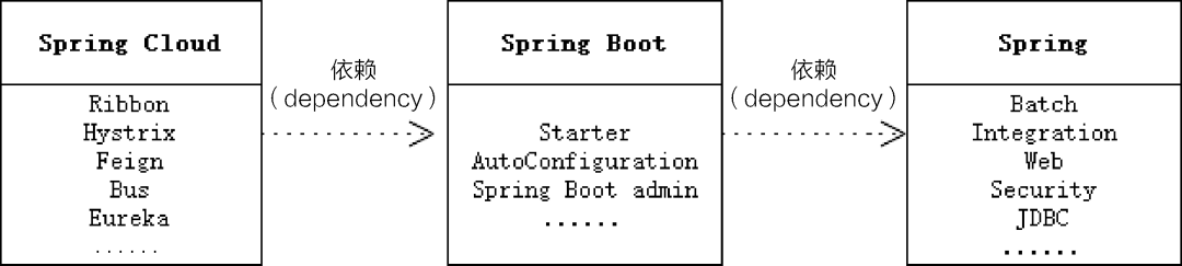 从上面对三者的介绍中可以看出,Spring Boot其实是要依赖Spring的,并不是另起炉灶创建了一个全新的框架,它是Spring的自动化。Spring Cloud通过依赖Spring Boot来构建微服务应用。三者的关系如下图所示。