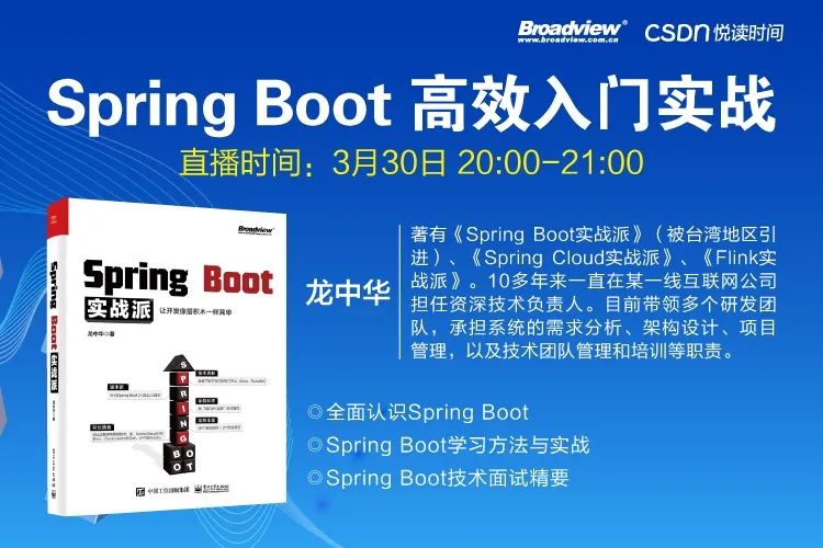 为了方便读者们学习Spring Boot,CSDN最新一期线上分享邀请到龙中华老师为大家直播分享“Spring Boot高效入门实战”,欢迎大家关注学习。