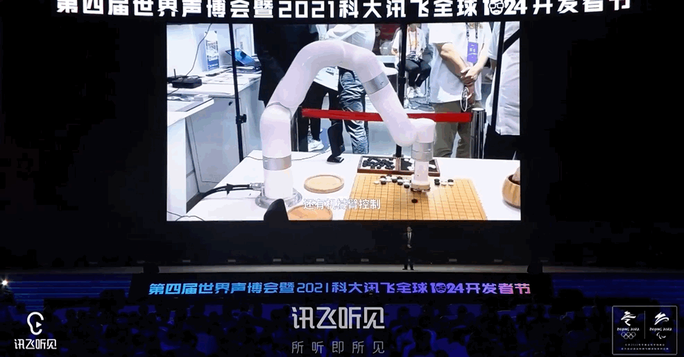 AlphaGo当时需要一个人拿旗子进行对弈,而科大讯飞iFlyGo(飞狗)通过各种技术整合,是一个真实的对弈的机器人。