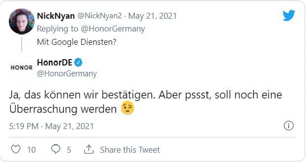 荣耀德国官方推特发布了一条消息称新的荣耀手机将会搭载谷歌移动服务(GMS)。不过这条推特很快也被删除了。