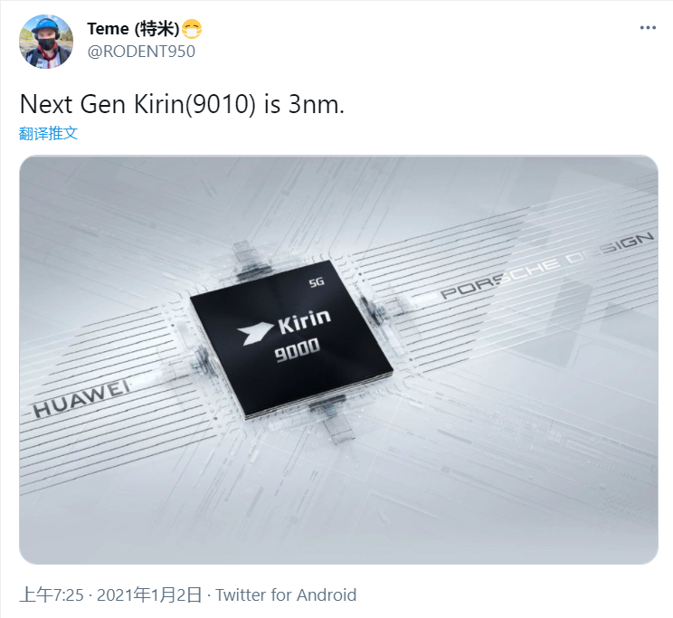 在年初就有热心网友在Twitter上爆料:下一代麒麟(可能叫9010)的处理器将采用3nm技术。
