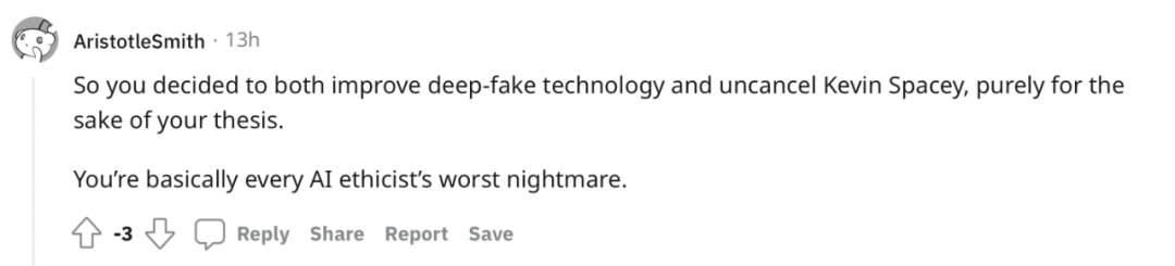 「所以你决定既要改进deep-fake,又要使用凯文-史派西(有道德污点)。你基本上是每个人工智能伦理学家最糟糕的噩梦。」