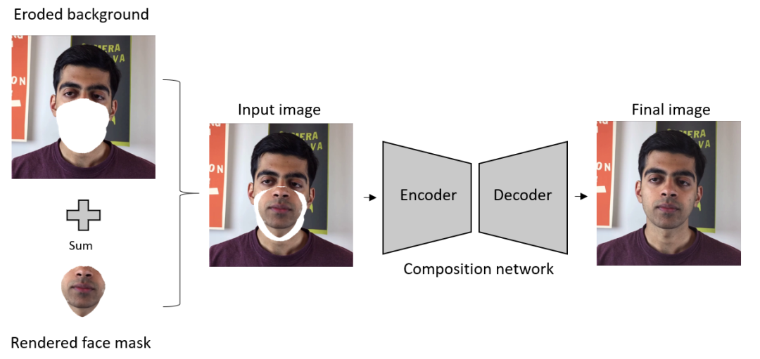为了将输出图像嵌入到背景中,需要单独训练另一个基于背景和先前输出的合成网络。
