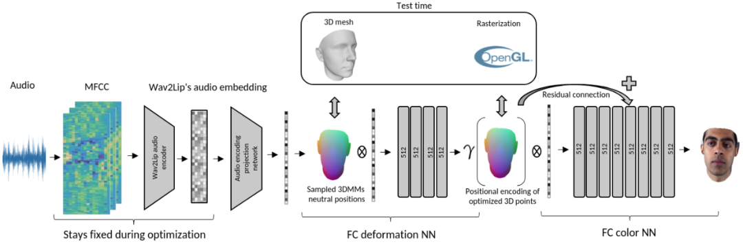 对于给定的语音,模型可以预测中性空间的RGB颜色和3D顶点位移。音频特征向量过滤的时间稳定性可以提供平滑的唇音同步。