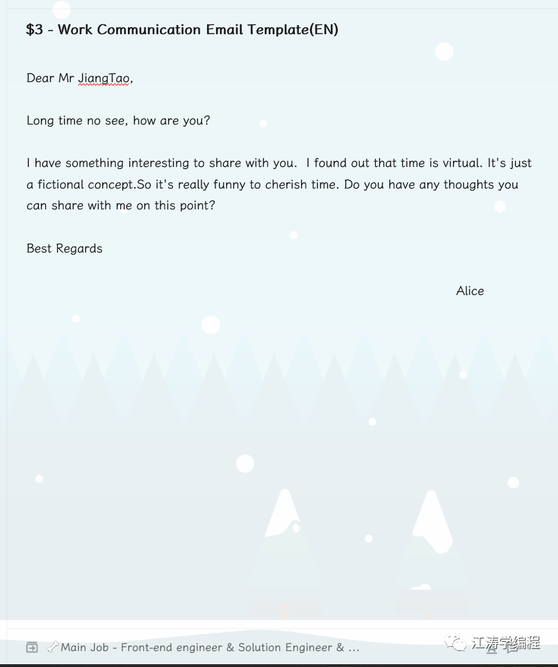 Hi,欢迎大家在有空的时候做客【江涛学编程】,这里是2023年的第2篇原创文章,今天我们来聊聊在职场中如何写好Email。