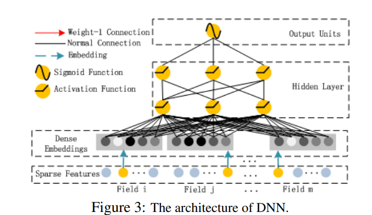该部分和Wide&Deep模型类似,是简单的前馈网络。在输入特征部分,由于原始特征向量多是高纬度,高度稀疏,连续和类别混合的分域特征,因此将原始的稀疏表示特征映射为稠密的特征向量。