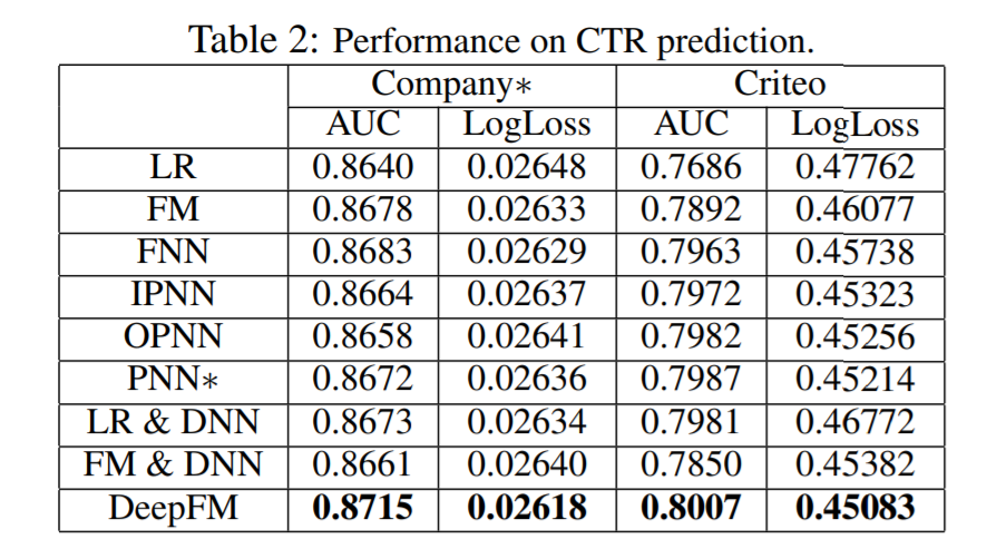 如表2所示,不同模型在Company*数据集和Criteo数据集上对点击率CTR进行预估的性能表现。DeepFM在各个指标上表现均强于其他模型。