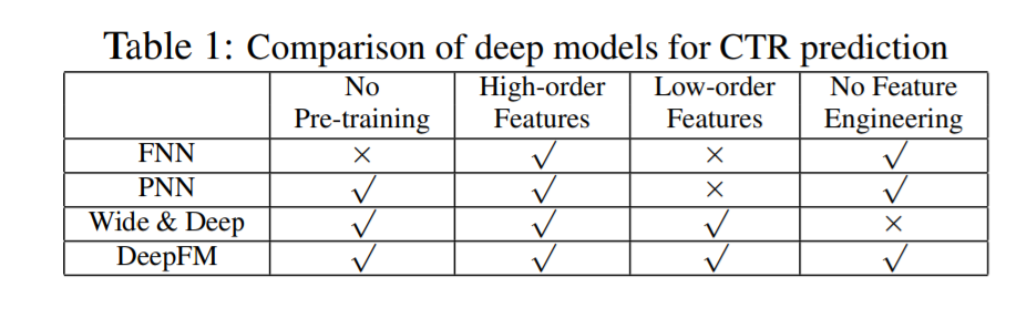 如表1所示,关于是否需要预训练,高阶特征,低阶特征和是否需要特征工程的比较上,列出了DeepFM和其他几种模型的对比。DeepFM表现更优。