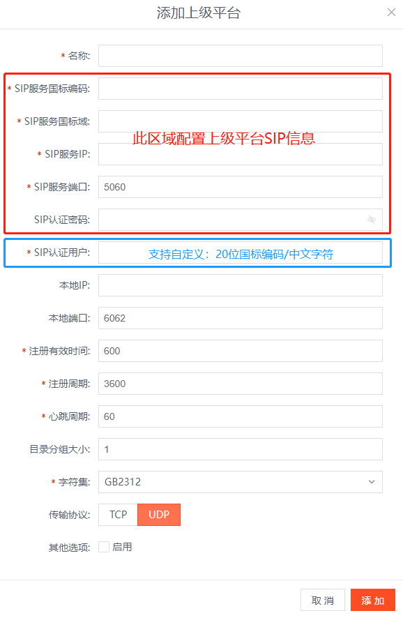 另外,“SIP认证用户”若要填写中文,则需上级平台支持(即不对此做校验),否则仍以20位国标编码为准。