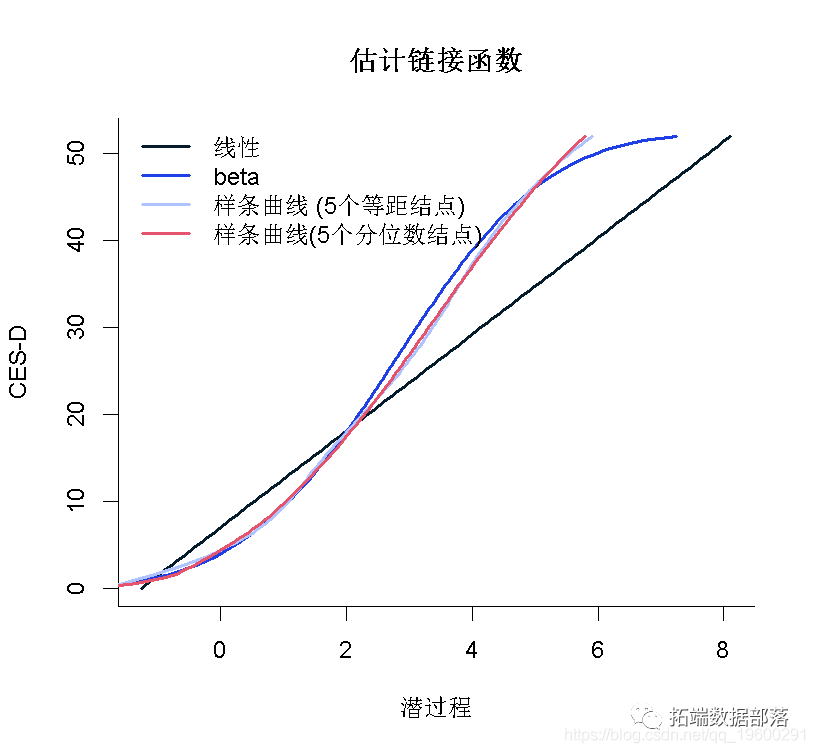 在这种情况下,根据AIC标准,由I-splines和5个分位数结点链接函数的模型提供了最佳拟合度。可以在图中比较不同的估计链接函数: