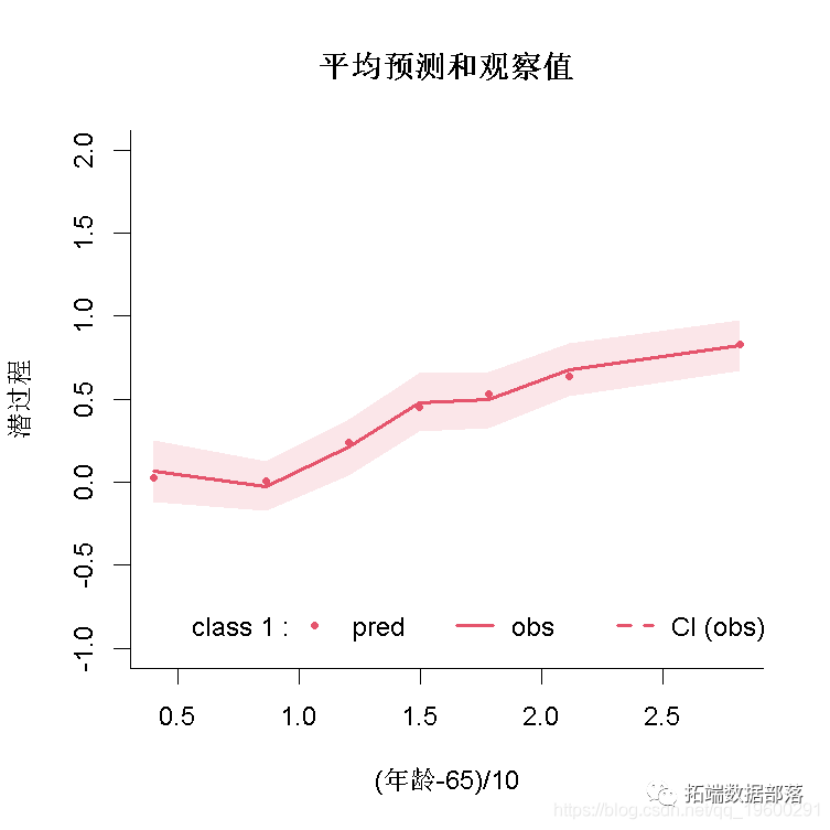 可以根据年龄绘制平均预测和观察值。请注意,预测和观察是在潜过程的范围内(观察是通过估计的链接函数进行转换的):