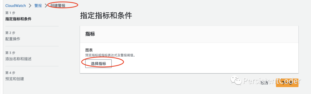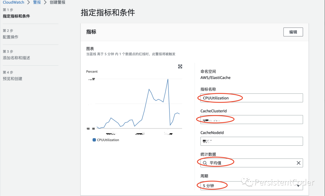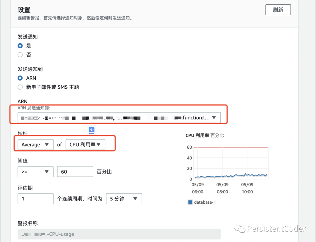 选择集群或者某个节点的cpu使用率指标,然后配置阈值,超过阈值后发送通知给指定sns,触发lambda调用告警通知到飞书机器人。