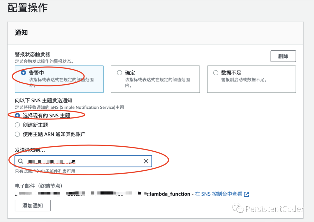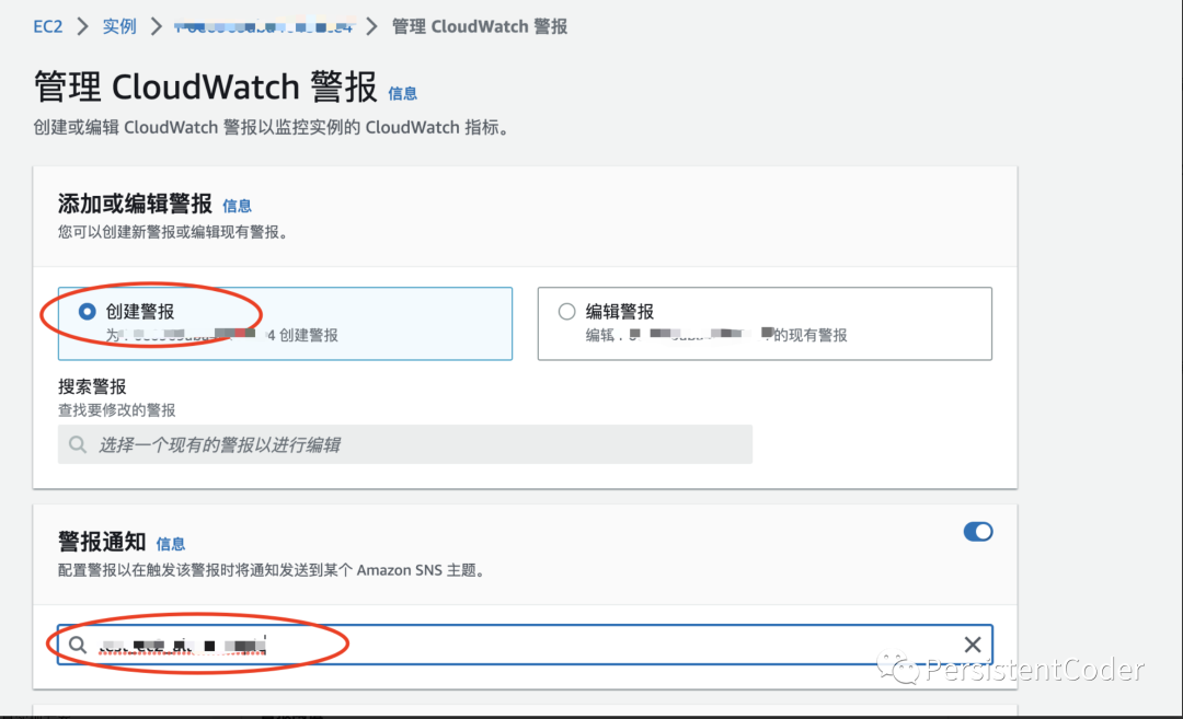 选择创建警报,并配置产生警报时发送到sns主题,这里选择我们刚刚创建的主题。