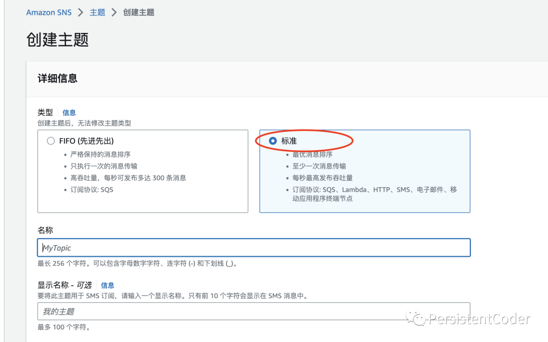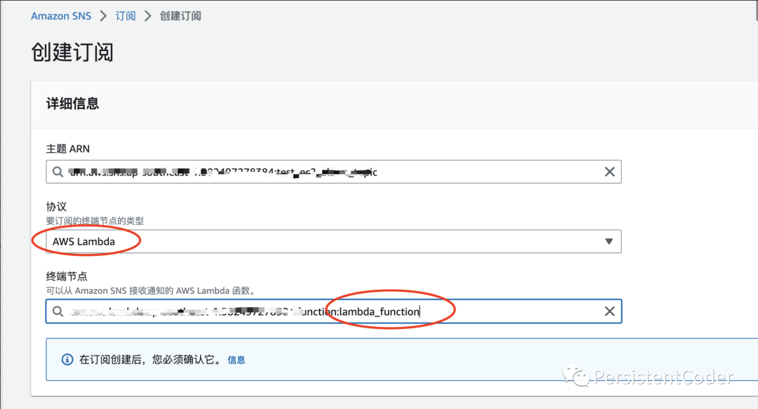 协议选择aws lambda,然后终端节点选择刚刚创建的lambda函数。