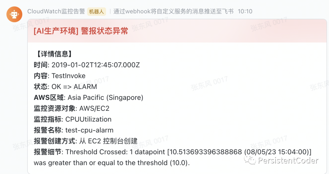基于aws Cloudwatch创建监控和告警后,可以将告警信息结合SNS主题和lambda函数发送通知到告警群,比如钉钉、企业微信、飞书等等。本篇我们就详细介绍下如何将Cloudwatch告警信息推送到告警群,以飞书为例。