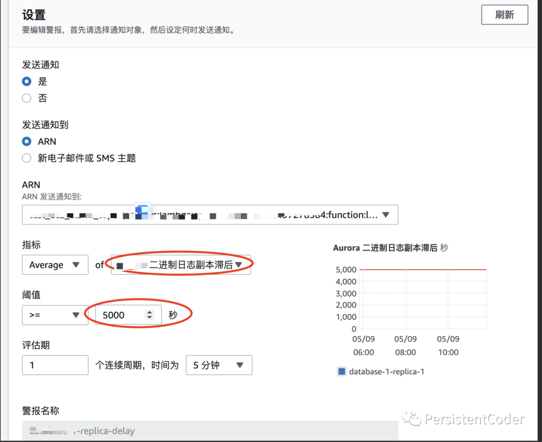 上述配置表示主从同步延迟5秒钟持续5分钟就会触发告警。