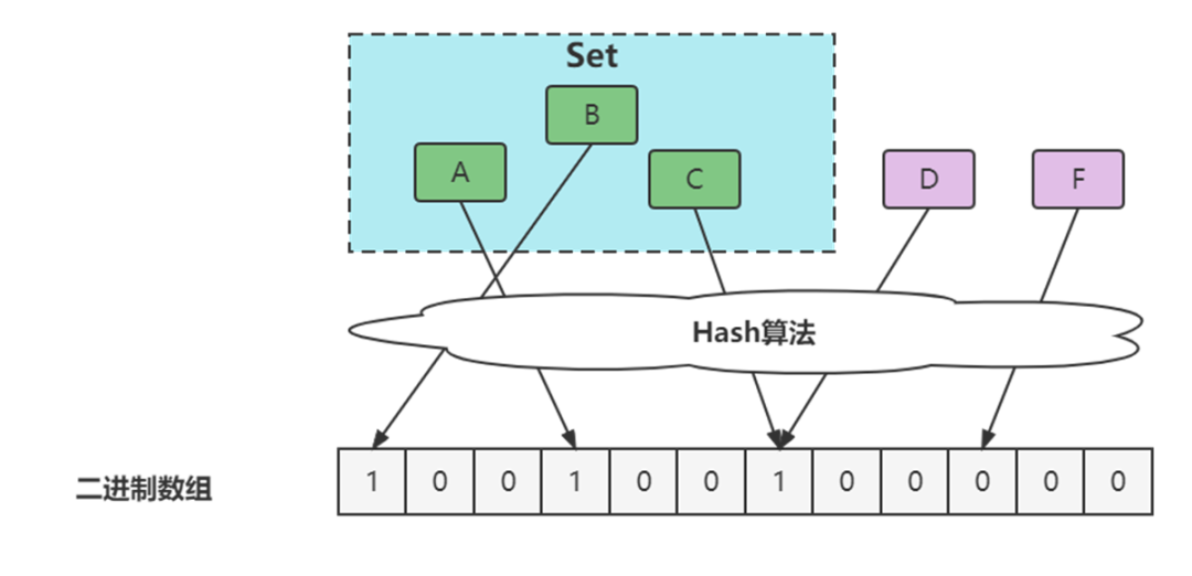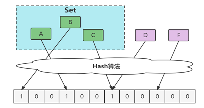 1970 年布隆提出了一种布隆过滤器的算法,用来判断一个元素是否在一个集合中。这种算法由一个二进制数组和一个 Hash 算法组成。
