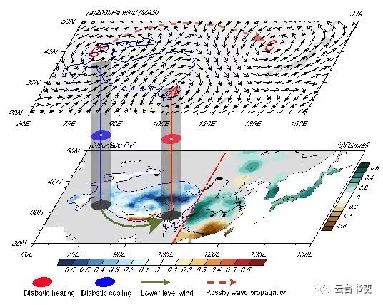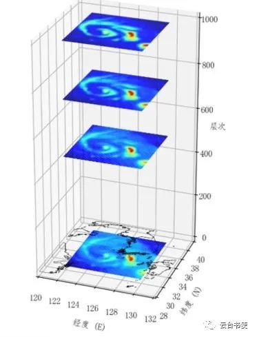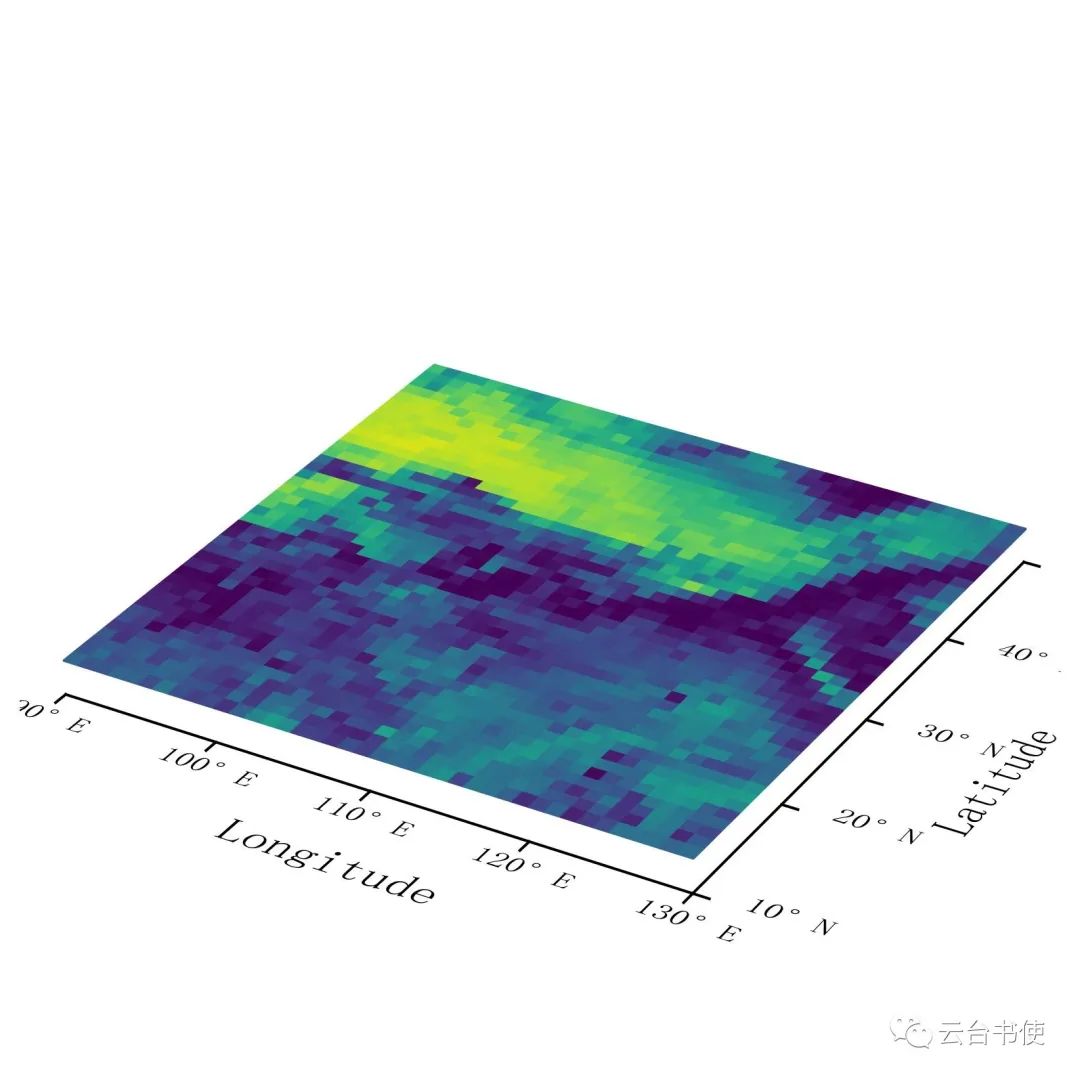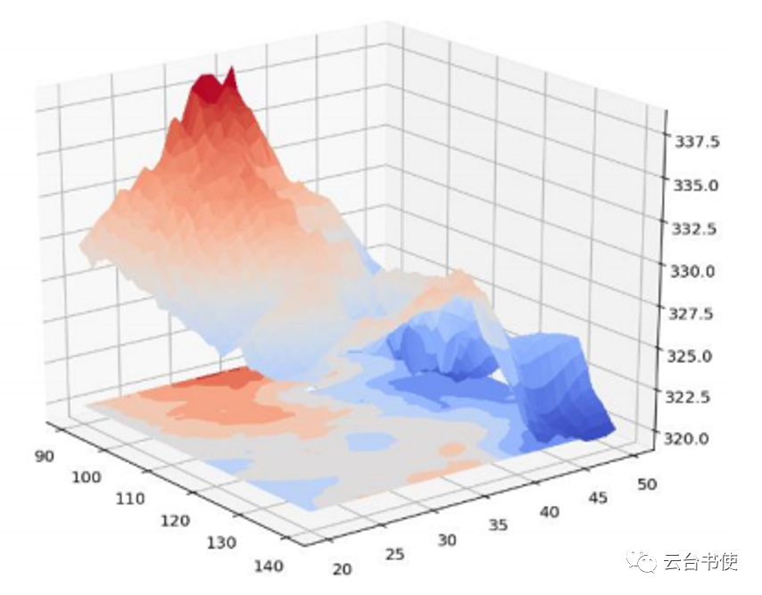 在当前的三维投影中,暂时没有axes3D.pcolormesh这个平面图中常用的栅格化绘图函数,但是,我们可以使用plot_surface命令替代这个效果。plot_surface是一个通过拼接polygon来实现立体可视化效果,具体可见李开元老师绘制的一张假相当位温图: