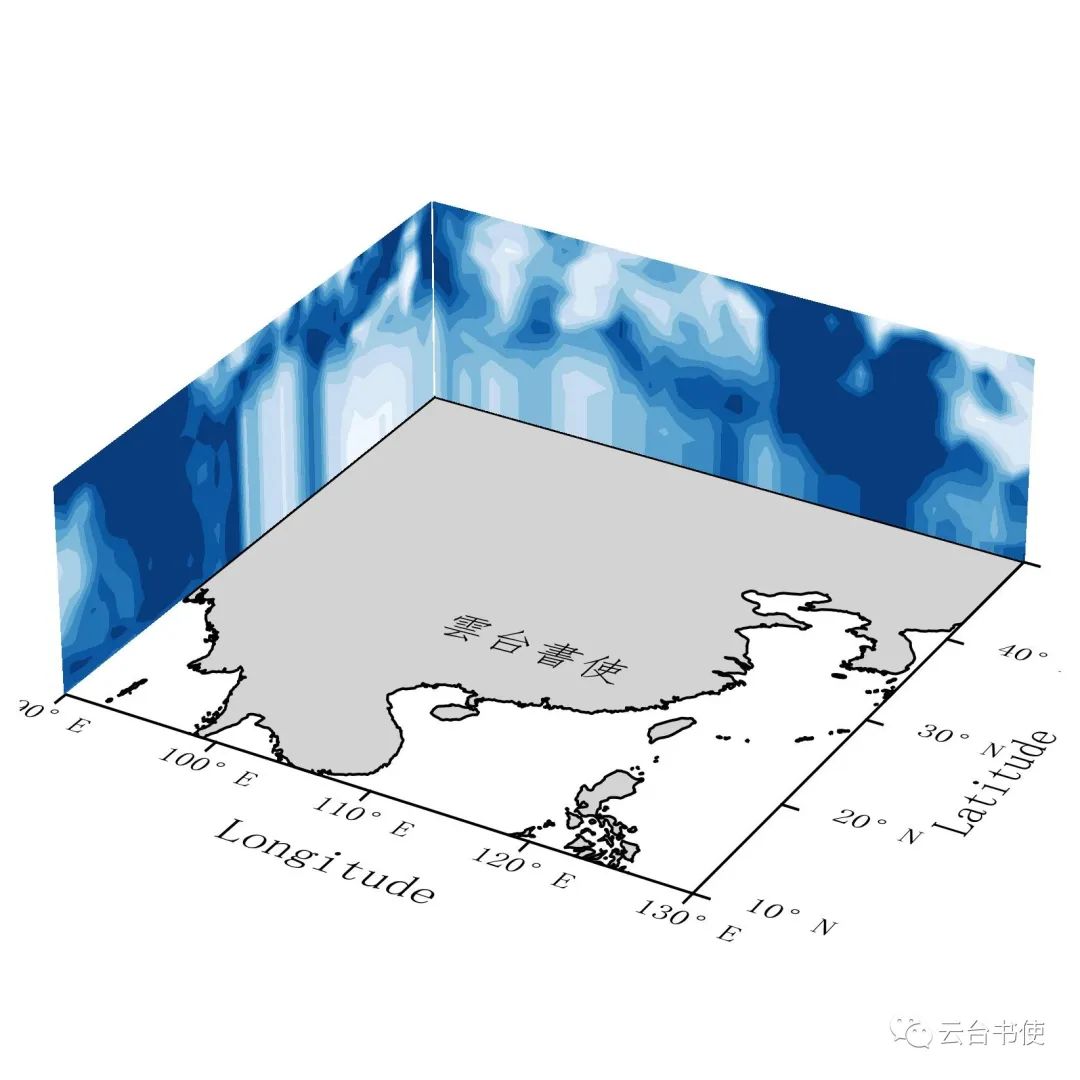 从上图不难看出,在东经90°剖面上,相对湿度在北纬25°以北突然降低到非常小的范围;在北纬50°剖面上,相对湿度在东经105°-115°有一个深厚的湿区。由于我们使用的是pcolormesh函数,所以所有的栅格类数据都可以这样进行剖面可视化,经过与平面出图对比,应该是没有多大问题的。