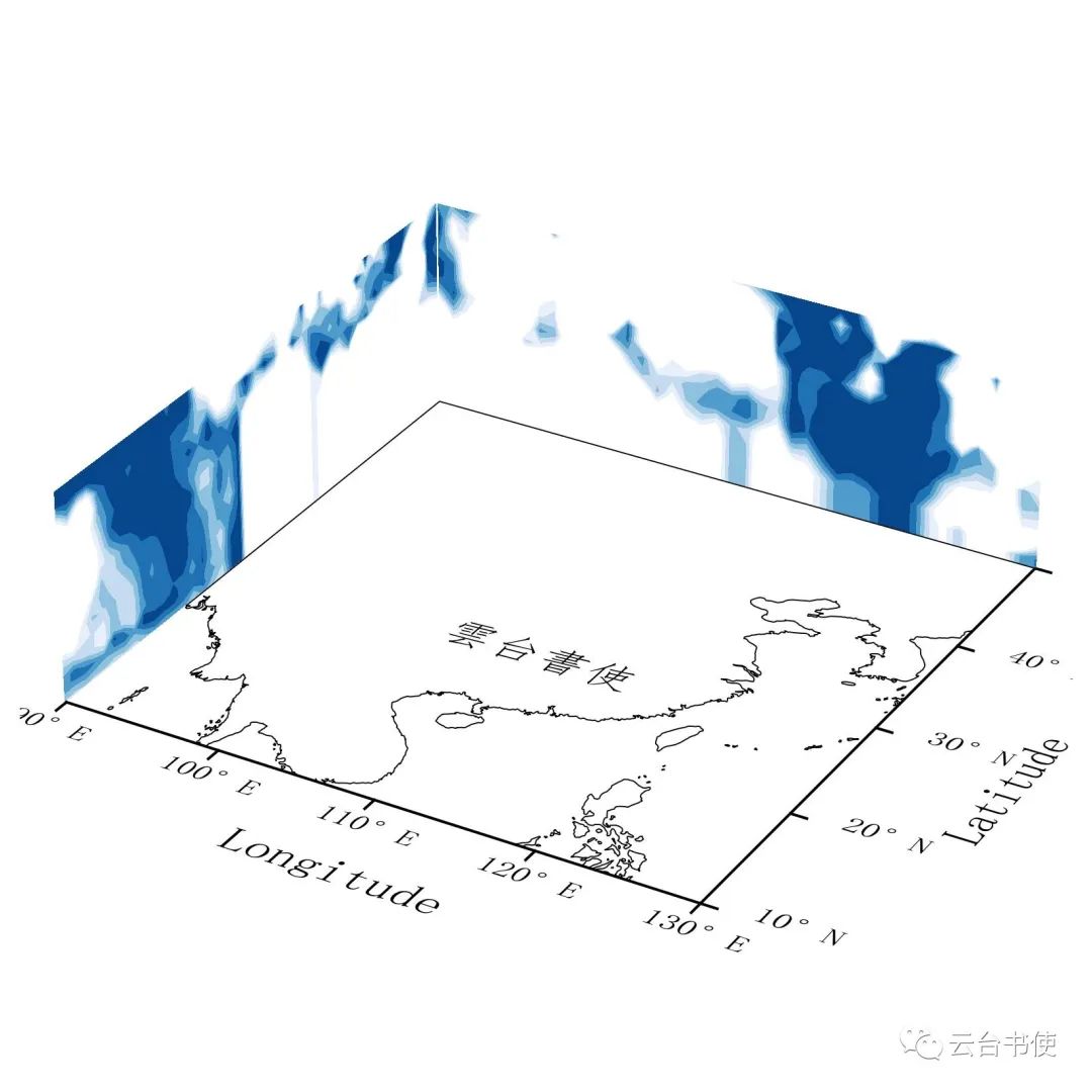 接下来,我们不妨考究这一张图片,以这一张图片看看其主要元素怎么使用单纯使用matplotlib进行仿制。首先看底层,左侧为青藏高原地形下的数据,且仅含有青藏高原数据。右侧为依靠经线为分界线,使东经100°左侧无数据;中层为两个链接柱;上层为箭头风场。其他小细节,上面已有论述,不必絮叨,但是怎么实现白化数据挖空,需要另外指出。对于contourf函数来说,使用levels参数,就可以控制数据的上下界限,例如: