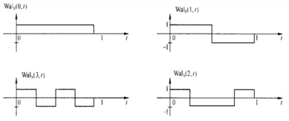 正交沃尔什函数 沃尔什(Walsh)函数集是完备的非正弦型的二元(取值为+1与-1)正交函数集, 其相应的离散沃尔什函数简称为沃尔什序列或沃尔什码。 沃尔什函数是定义在半开区间 [0,1) 的矩形波族, 每个矩形波有一个编号 n(