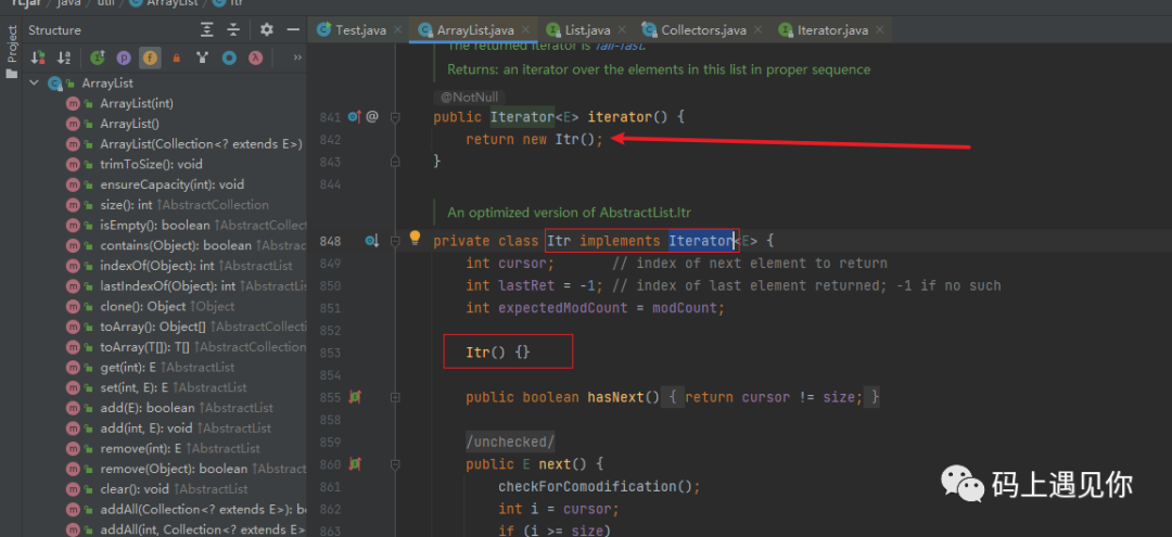 Itr其实就是ArrayList里的一个内部类,实现了Iterator