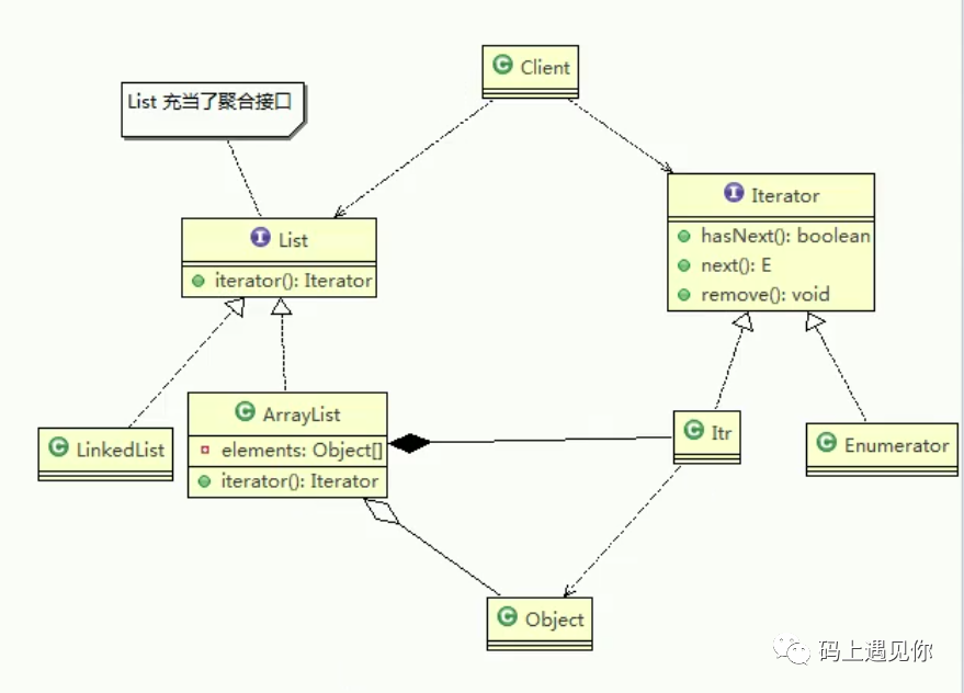 不用再考虑聚合的类型,使用一种方法就可以遍历对象了。隐藏了聚合的内部结构,客户端要遍历聚合的时候只能取到迭代器,而不会知道聚合的具体组成。单一责任原则)。在聚合类中,我们把迭代器分开,就是要把管理对象集合和遍历对象集合的责任分开,这样一来集合改变的话,只影响到聚合对象。而如果遍历方式改变的话,只影响到了迭代器。相似对象,或者遍历一组相同对象时使用, 适合使用迭代器模式缺点 每个聚合对象都要一个迭代器,会生成多个迭代器不好管理类