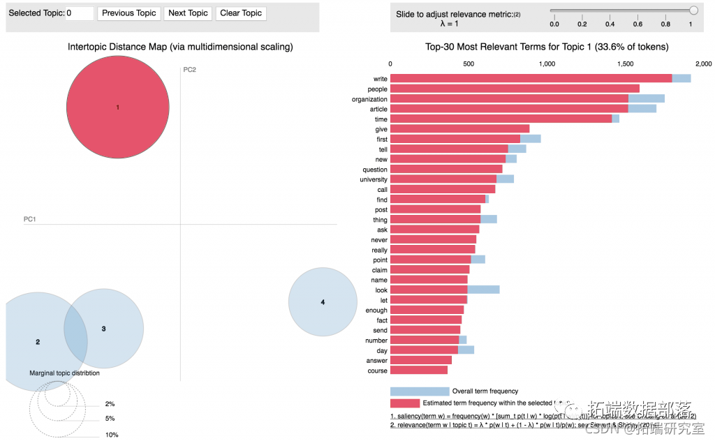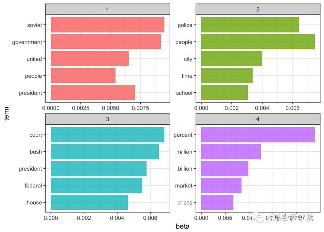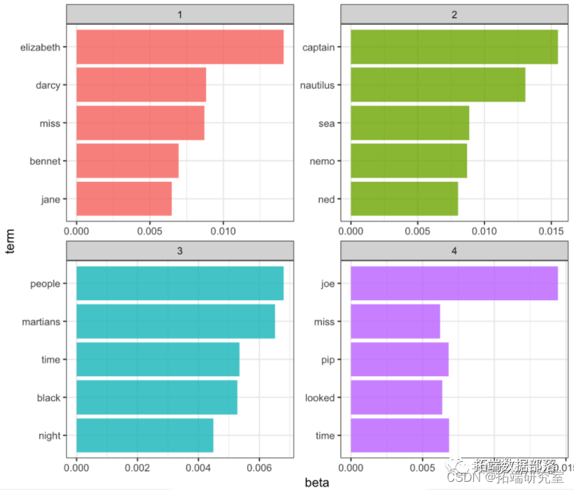 另请注意,LDA()不会为每个主题分配任何标签。它们只是主题1,2,3和4. 我们可以推断这些与每本书有关,但它仅仅是我们的推论。