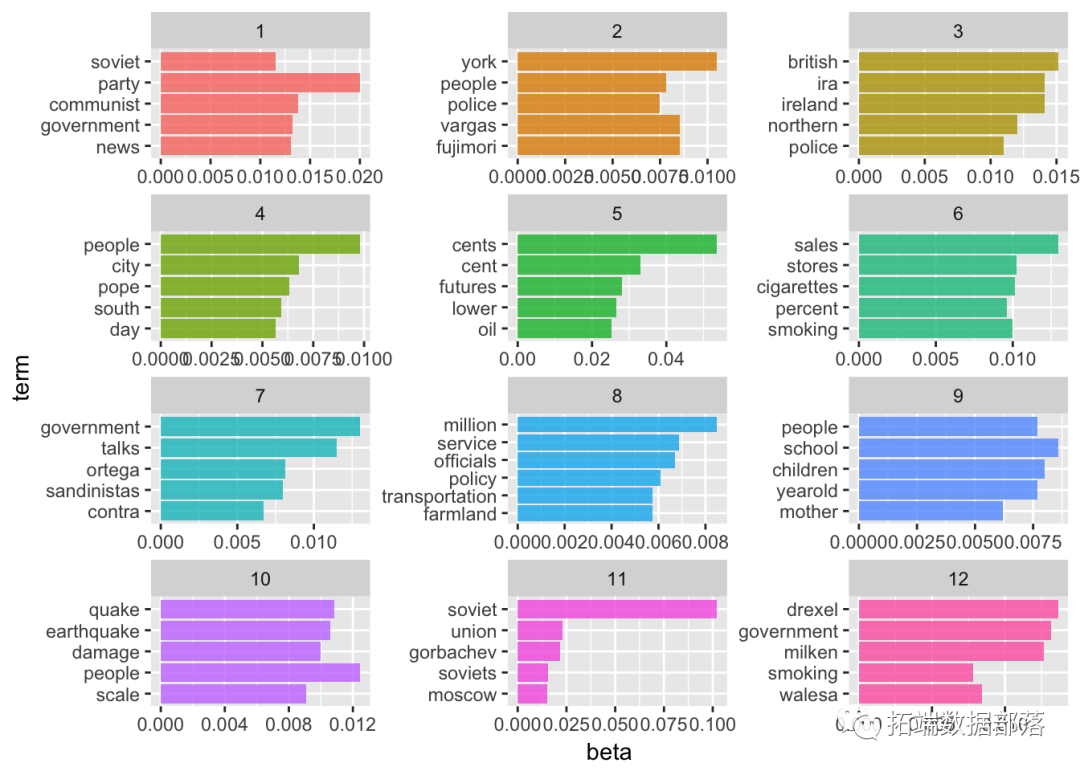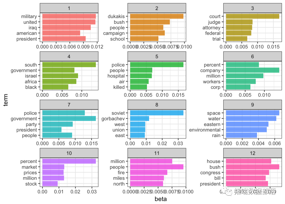 看起来100主题模型具有最低的困惑分数。这会产生什么样的主题?让我们看一下模型产生的前12个主题: