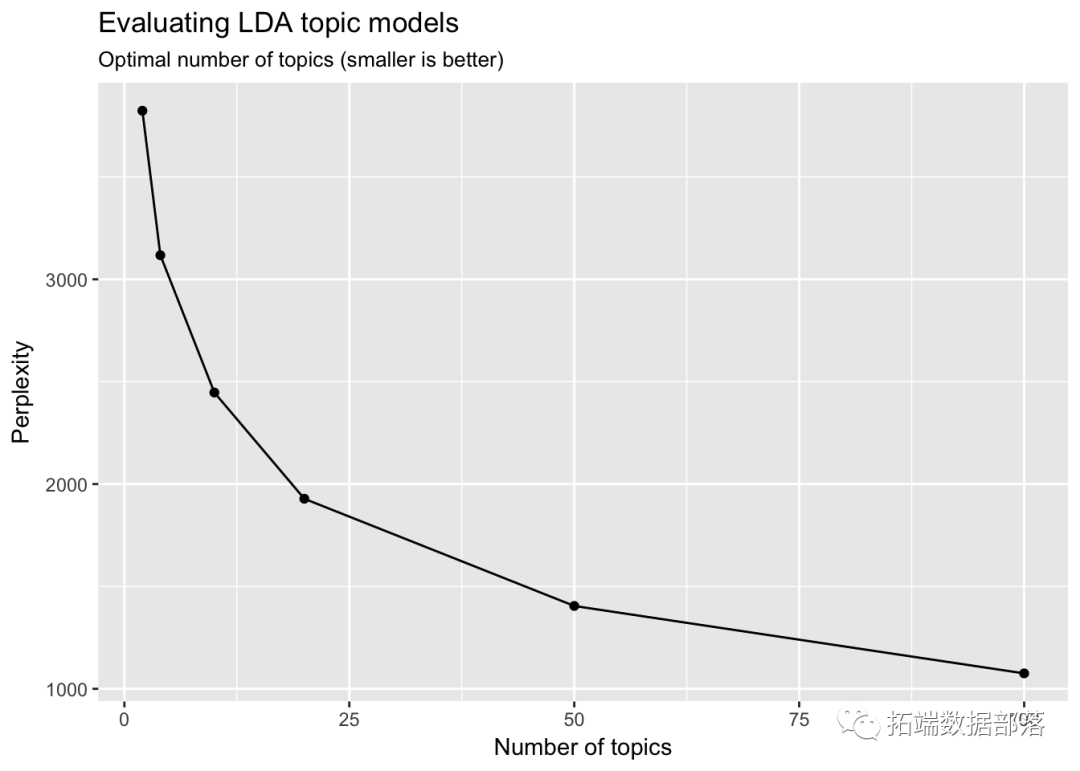 ## [1] 2301.814但是,统计数据本身有点无意义。这种统计数据的好处在于比较不同模型的不同k的困惑度。具有最低困惑度的模型通常被认为是“最佳”。