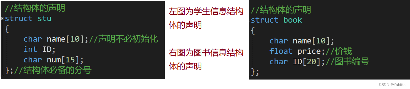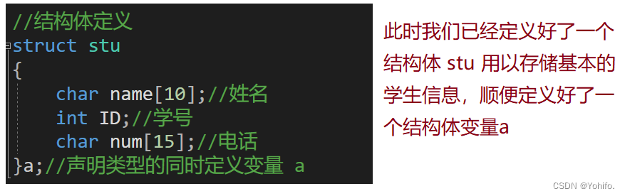 结构体定义很简单,前面已经间接展示过了,也就是将声明与成员变量结合在一起