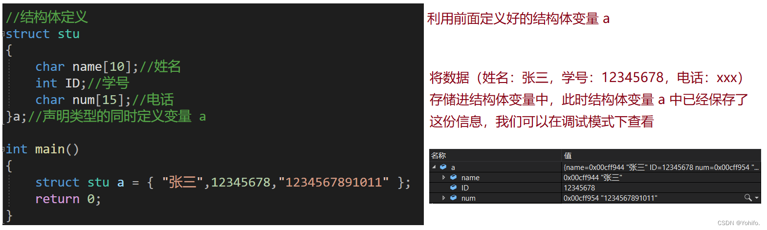 struct stu a = { "张三",12345678,"1234567891011" };