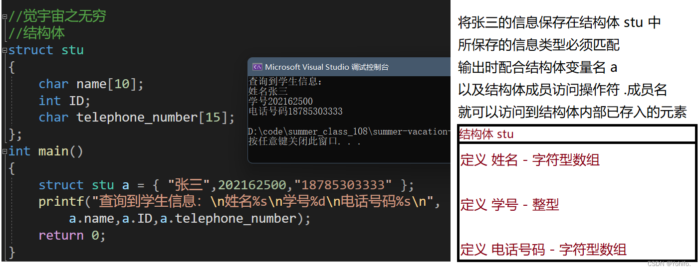 无论是整型、实型还是我们的数组,它们都只能描述单一对象,无法对一个复杂对象进行描述,比如我们的学生信息,包含学生姓名(字符型数组)、学号(整型)、电话号码(整型数组)等,将需要的信息整合在一起,配合上结构体关键字(struct),这样我们就得到了一个结构体变量。合理使用结构体变量能让我们对现实世界中的信息做出更好的描述。一起看看结构体吧!🎉🎉🎉