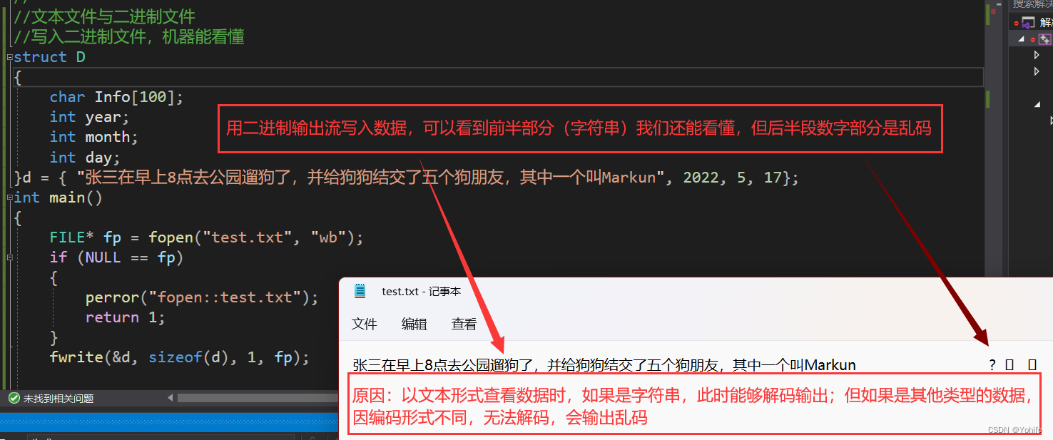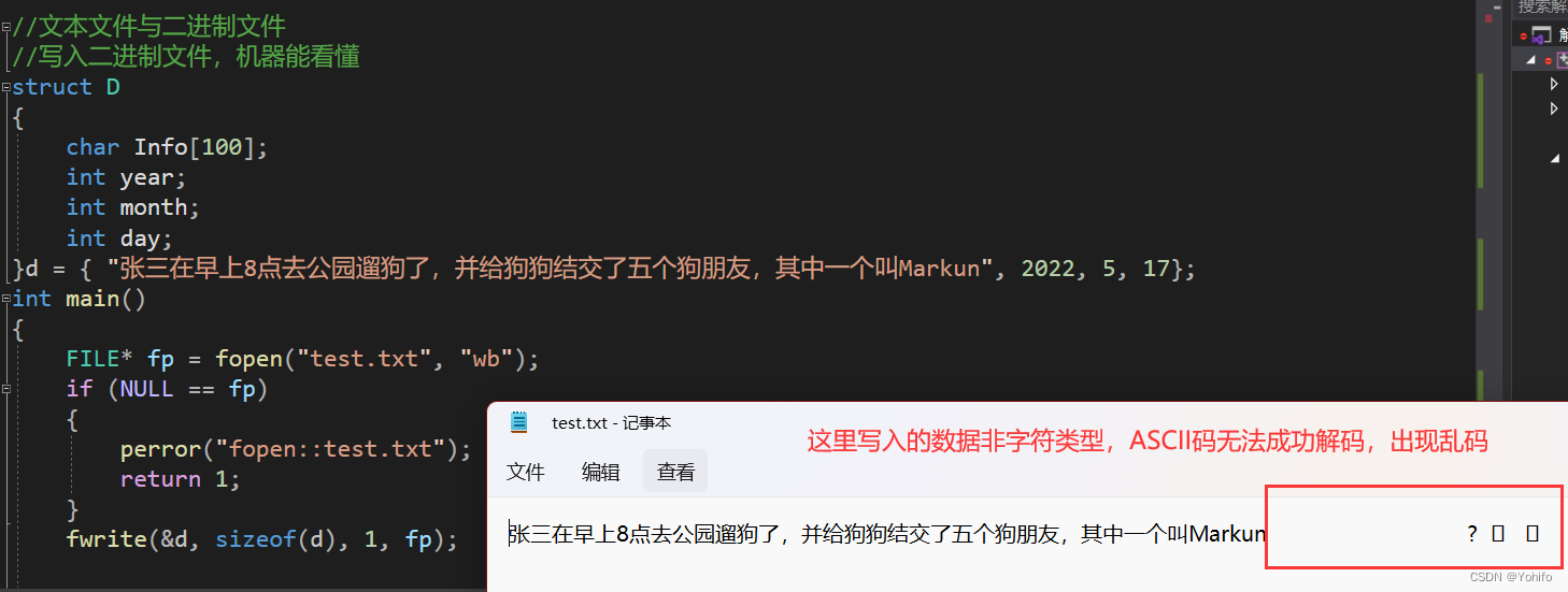 二进制文件是将数据编译后转成二进制形式,然后直接存储的文件,这种文件机器能秒懂,读取效率很高(因为不需要转译),但二进制一般人是看不懂的,部分二进制数据也无法通过ASCII码解码为正确的数据,因此强行输出二进制文件,极有可能会得到乱码。比如将上面的那段话通过二进制形式写入文件中,可以看到除字符类型数外,其他类型的数据变成了乱码。