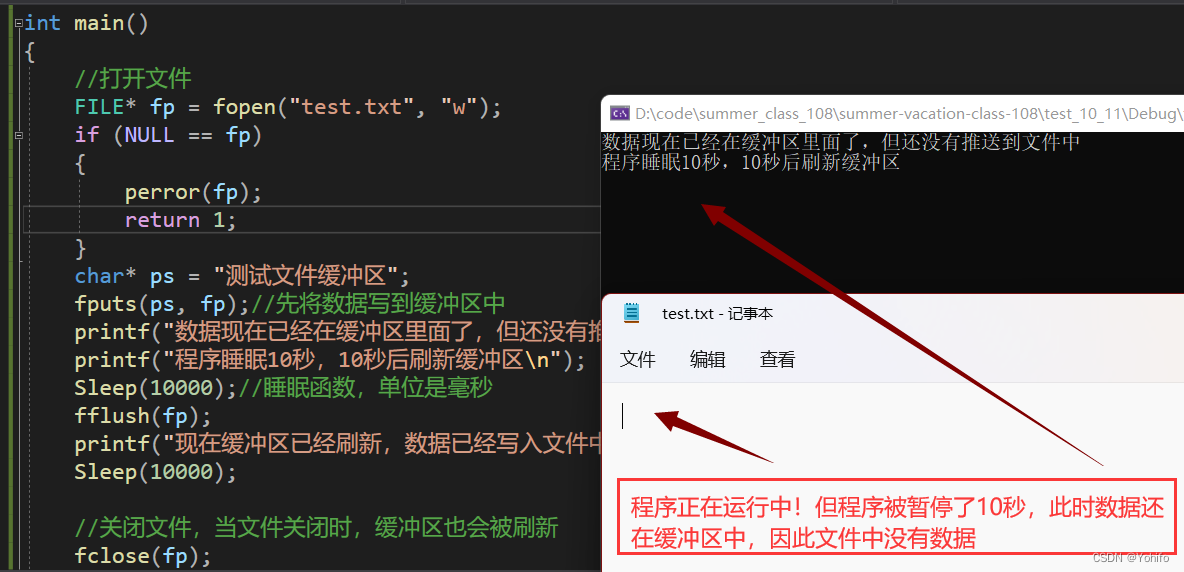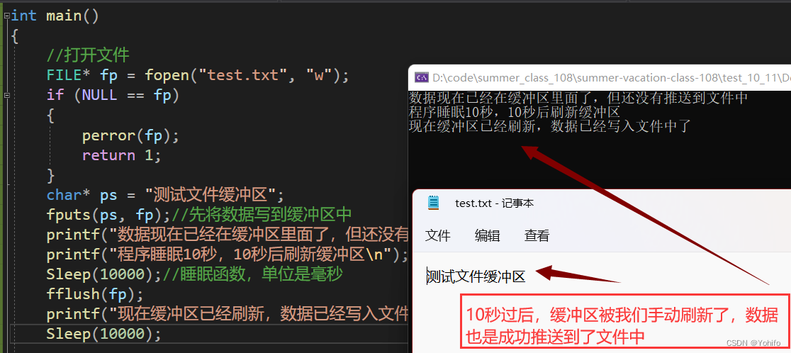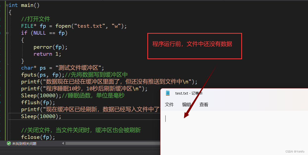 我们可以利用睡眠函数 Sleep 来使程序暂停,此时数据还没有被写入文件中,仍然位于缓冲区;之后再手动刷新缓冲区,数据此时会被推送至文件中。