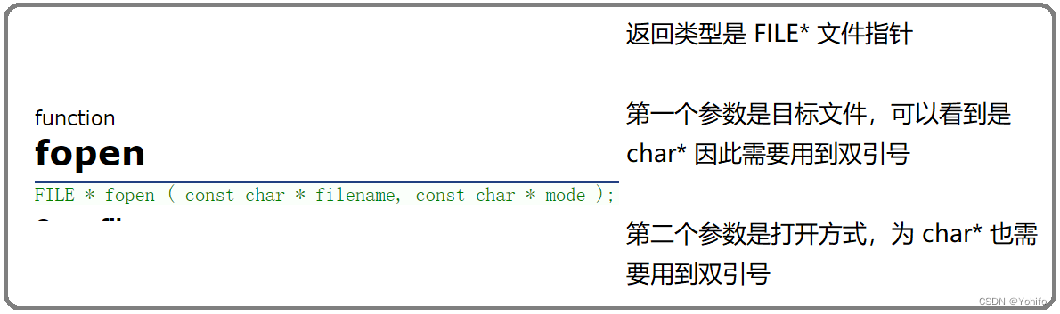 文件打开用的是 fopen 这个函数,fopen 的作用是从一个文件中以某种方式打开文件,返回类型是 FILE* 即打开文件的起始地址,因此我们需要用一个 FILE* 类型的指针来接收。