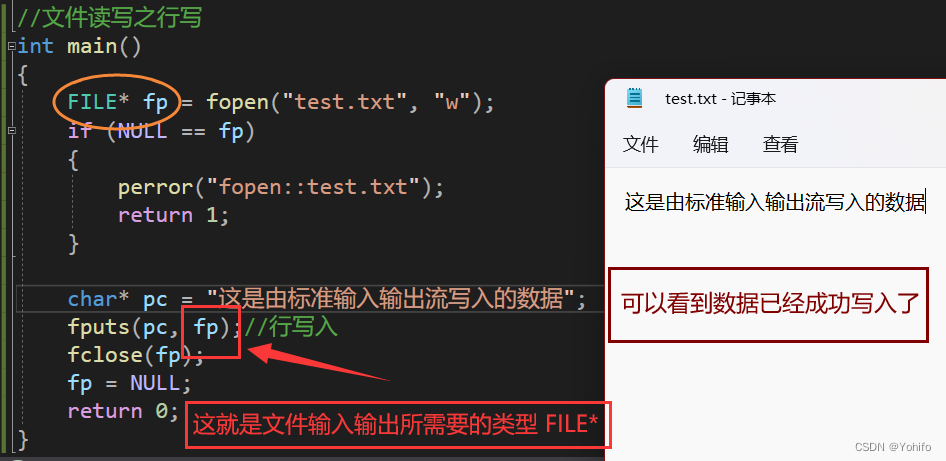 顾名思义,文件输入输出流所依赖的载体为文件,无论是输入还是输出数据,都是在文件上进行的,因此它的对象类型为 FILE* ,文件输入输出流可以使用所有输入输出流函数,比如fputc、fprintf、fscanf等,使用时只需要加上目标流类型就行了。