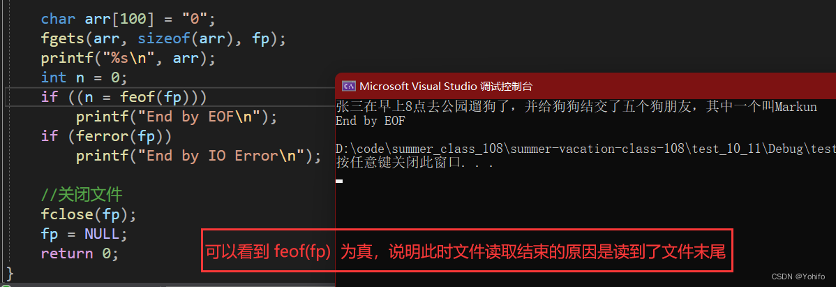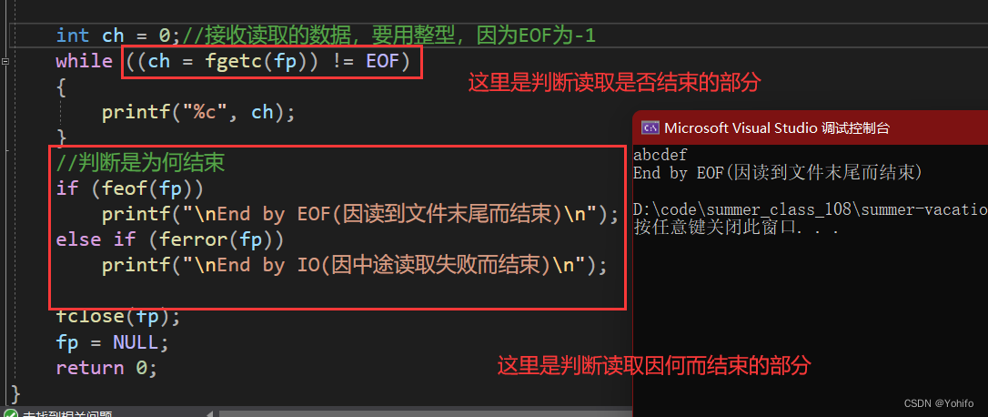 很多人在写C语言课设的时候(学生信息管理系统、通讯录系统等),会通过 feof 来判断文件是否读取结束,这是一种错误的用法,因为 feof 的作用是判断当前文件读取结束原因的,如果是因为读取到了末尾而结束,feof(fp) 就为真;除了这个以外,还有另一个文件读取结算原因判断函数,ferror ,当 ferror(fp) 为真时,说明此时发生了读取异常,并非正常结束,我们可以通过这两个报错函数来判断文件读取结束的真正原因。