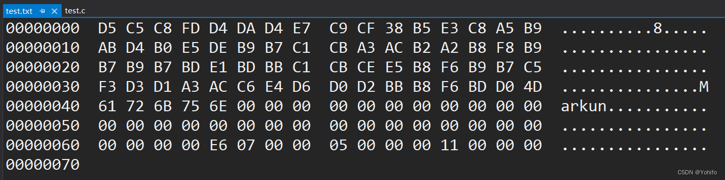 下图为上面的二进制文件在内存中以二进制形式存储的样子,显示为十六进制(节省空间),实际为二进制。