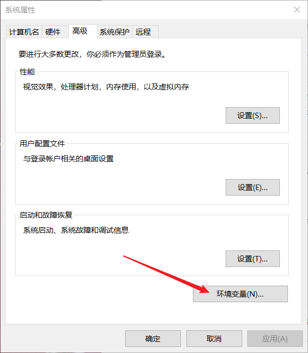 “计算机”图标上点击右键->属性->高级系统设置(win10 20H2需要在属性窗口的后面才能找到高级系统设置),在高级系统设置窗口的右下角点击“环境变量”。