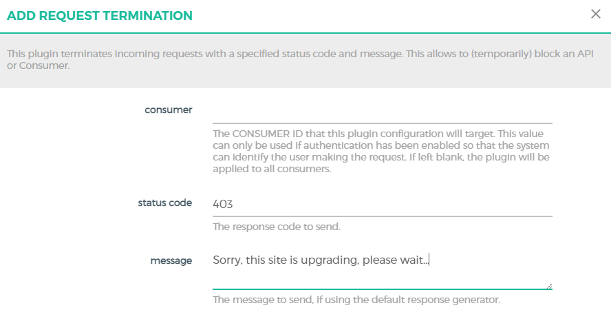 在Kong中,Traffic Control插件类型中就提供了一个Request Termination的终止请求插件。