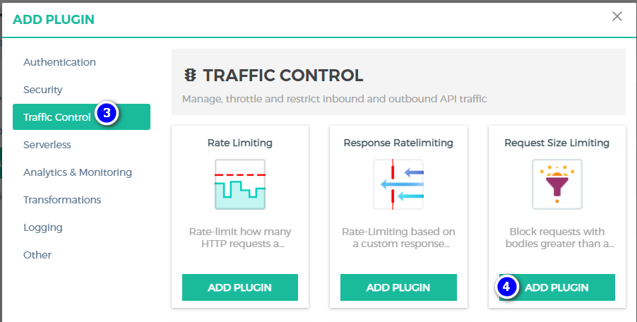 其次,找到Traffic Control类别,然后找到Request Size Limiting插件,点击ADD PLUGIN按钮。