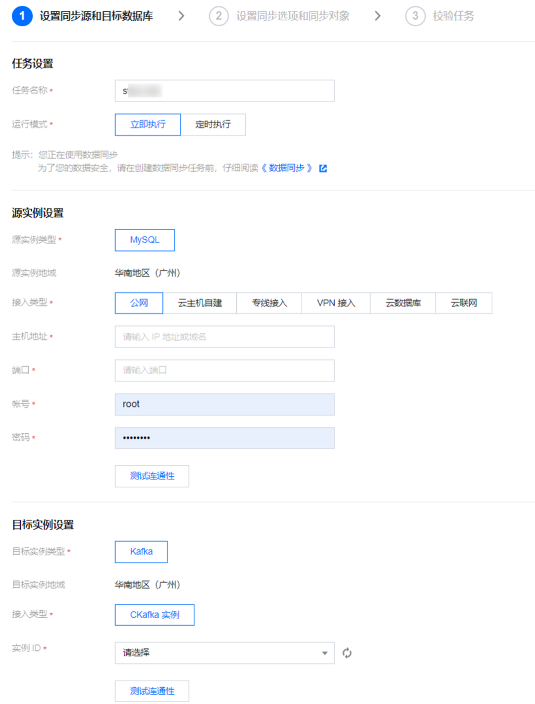 配置 DTS 连接源库和目标库,源库配置中填入 MySQL 的主机地址/端口/用户名/密码,目标库选择 CKafka 实例 ID。